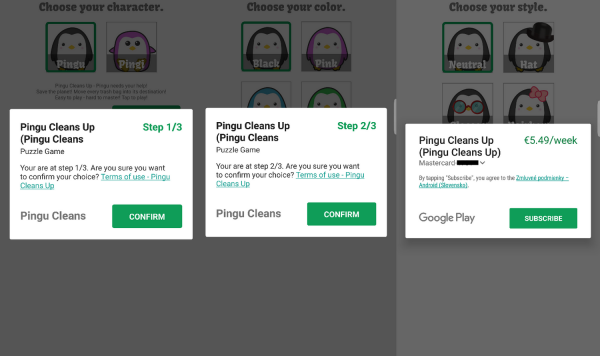 На последнем, третьем этапе пользователь с банковской картой, привязанной к аккаунту Google Play, видел окно, визуально напоминающее предыдущие. Однако кнопка «Подтвердить» была заменена кнопкой «Подписаться». Нажав на нее, пользователь оформлял подписку стоимостью 5,49 евро (около 400 рублей) в неделю. Платеж списывался с карты автоматически до момента отмены подписки.
