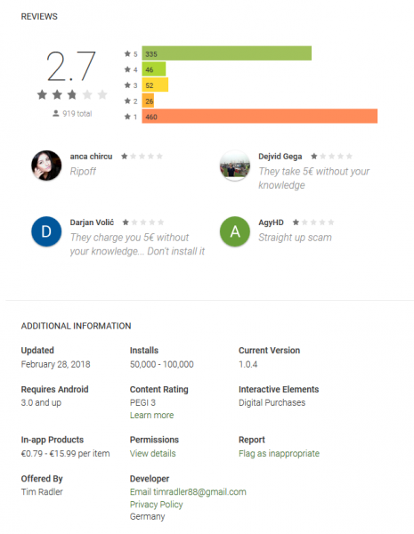 Простая мошенническая схема основалась на предположении, что многие пользователи кликнут по любому окну, мешающему игре, не глядя и практически не вчитываясь в текст. Судя по многочисленным негативным отзывам, оставленным приложению в Google Play, данный метод действительно работал.