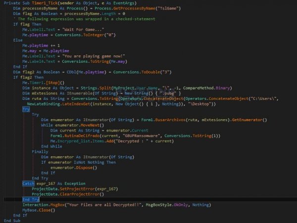 Вымогатель отслеживает процесс с «TslGame» в имени и считает, сколько времени жертва провела в игре, в итоге расшифровывая файлы. При этом вредонос не проверяет, действительно ли игра установлена на зараженной машине и запущена, но обращает внимание только на имя процесса. То есть PUBG можно легко обмануть.