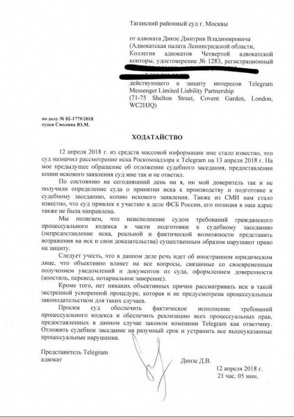 Просим суд обеспечить фактическое исполнение требований процессуального кодекса и обеспечить реализацию всех процессуальных прав, предоставленных в данном случае законом компании Telegram как ответчику. Отложить судебное заседание на разумный срок и устранить все вышеуказанные процессуальные нарушения», — гласил документ, подписанный Дмитрием Динзе.