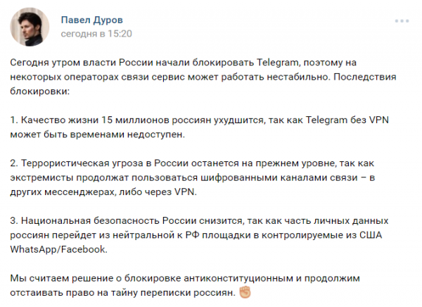 Павел Дуров прокомментировал начало блокировки на своей странице «ВКонтакте» следующим образом: