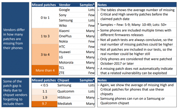 Нол и Лелл, однако, обнаружили, что и без того печальное положение вещей на самом деле выглядит еще хуже. На протяжении двух лет специалисты тщательно изучали состав обновлений безопасности, выпускаемых крупнейшими производителями устройств на базе Android, и проделали огромную работу, изучив свыше 1200 смартфонов.