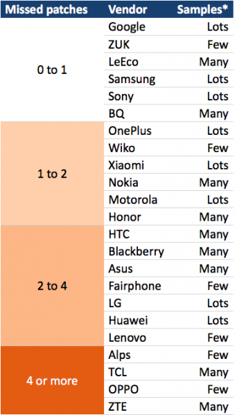 - 0-1 пропущенных патчей: Google, Sony, Samsung, Wiko Mobile;