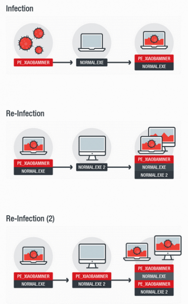 Дело в том, что новый XiaoBa должен заражать уже существующие пользовательские файлы, внедряя в них малварь. Так, майнер XMRig должен интегрироваться во все файлы EXE, COM, SCR и PIF, обнаруженные на компьютере жертвы. Авторы вредоноса хотели, чтобы запуск любого приложения также запускал и майнер. Однако из-за багов в коде XiaoBa работает некорректно. Он внедряет в каждый исполняемый файл по нескольку «копий» себя, а порой и вовсе берет одни легитимные файлы и многократно внедряет их в состав других легитимных файлов.