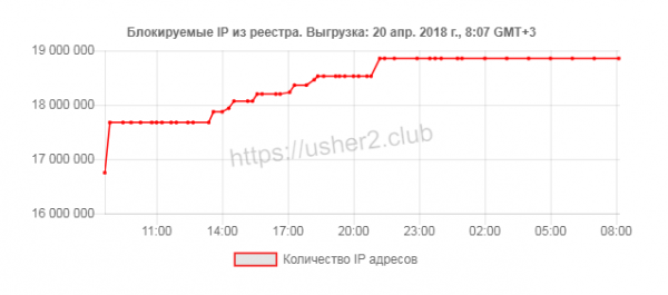 Вчера, 19 апреля 2018 года, реестр запрещенных сайтов пополнился сразу несколькими новыми подсетями. Суммарное количество блокируемых IP-адресов, согласно неофициальной копии выгрузки реестра, в настоящее время равняется 18,8 млн.