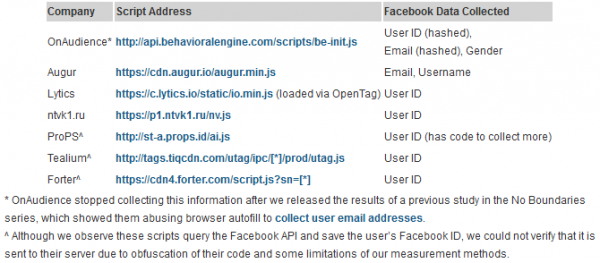 Специалистам удалось выявить семь аналитических сервисов, которые следят за посетителями таким образом. Хотя некоторые из них собирают лишь специфичные для конкретных приложений user ID и на первый взгляд кажутся безобидными, эксперты объясняют, что этот user ID можно конвертировать в Facebook ID, получив больше данных о пользователе. Как видно в приведенной ниже таблице, такие сервисы собирают email-адреса, имена пользователей и их ID, а также информацию о гендерной принадлежности.