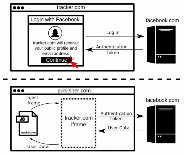 Второй сценарий сбора информации выглядит немного сложнее. В данном случае сторонние аналитические сервисы встраивают скрытые iframe на сайты, чтобы хитростью вынудить браузер пользователя войти через Facebook. Затем, как и в первом сценарии, осуществляется перехват и сбор данных о посетителе.