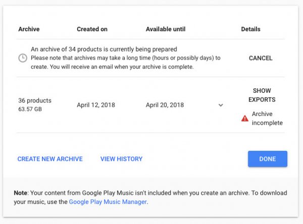 Если не хочешь качать такие?объемы, то заказывай частичные архивы, которые будут включать не все сервисы. Например, если выключить Photos, YouTube и Gmail, а также Drive, если ты там хранишь что-то помимо тестовых документов, то может получиться всего несколько сот мегабайтов. Кстати, чем меньше архив, тем быстрее приходит ссылка?на скачивание.
