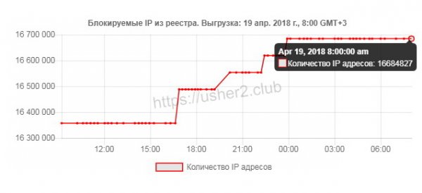 В среду многомиллионных пополнений реестра запрещенных сайтов более не происходило, стало ясно, что представители регулятора пытаются сменить тактику. Тем не менее, во второй половине дня реестр пополнился примерно 130 000 IP-адресами популярного хостинг-провайдера Digital Ocean (отслеживать выгрузку блокируемых IP можно на этом сайте, созданном энтузиастами).