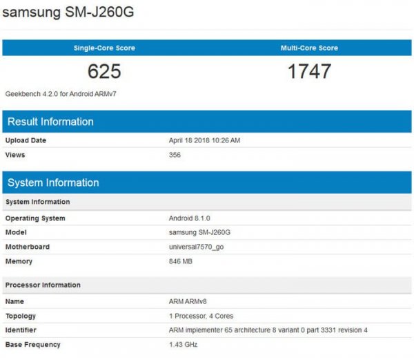 Еще не анонсированный на сегодняшний день девайс проявил себя под номером модели SM-J260G. Рассматриваемый смартфон базируется на чипсете Exynos 7570, оснащенном четырехъядерным центральным процессором. Грядущий девайс укомплектован одним гигабайтом оперативной памяти. Подобные весьма скромные технические характеристики соответствуют тем, которые характерны для смартфонов на базе программной платформы Android Go. Указан также и номер материнской платы — «universal7570_go», что делает рассматриваемые слухи более обоснованными.