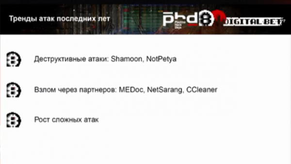 Руководитель отдела реагирования на угрозы информационной безопасности Positive Technologies Эльмар Набигаев рассказал о последних трендах атак. Исследования Positive Technologies показали, что все больше атак носят деструктивный характер и имеют целью уничтожить цифровую инфраструктуру. Также эксперты отмечают рост сложных атак: злоумышленники все чаще используют уязвимости нулевого дня и сложное вредоносное ПО. Среди ключевых выводов из расследований: даже в отсутствие уязвимостей нулевого дня публичные уязвимости очень быстро берутся на вооружение хакерами, поэтому патчи нужно ставить моментально.