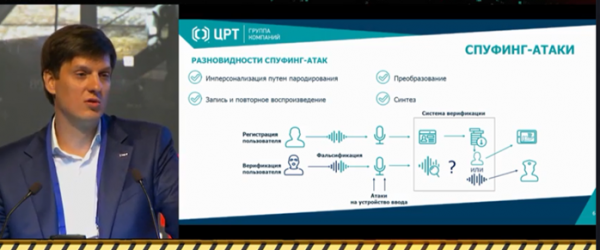 Также в рамках дискуссии генеральный директор «Центра речевых технологий» Дмитрий Дырмовский представил результаты исследования, на основе которых была разработана система, одержавшая победу в международном конкурсе среди разработчиков детекторов спуфинг-атак Automatic Speaker Verification Spoofing and Countermeasures Challenge 2017. Также он рассказал о видах спуфинг-атак, основных способах взлома и признаках фальсификации данных.