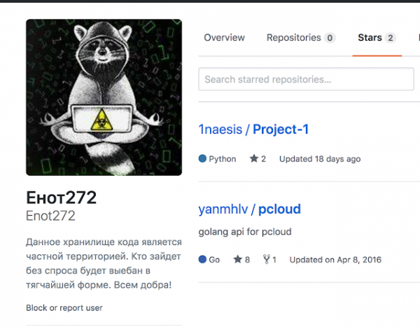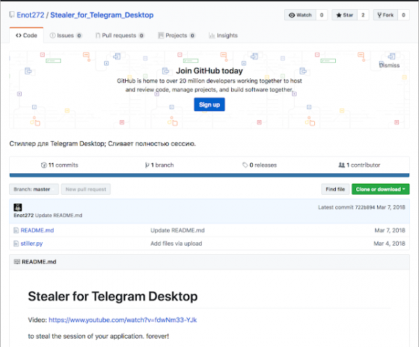 На другом хакерском форуме (sft.st) данная малварь рекламируется, как продукт на продажу. Там аналитики обнаружили ссылку на аккаунт GitHub, принадлежащий пользователю Enot272 , а также Python-скрипт и другие инструменты (уже удалены из репозитория, но можно увидеть на скриншоте ниже), при помощи которых пользователям предлагалось воспроизвести действия хакера и его демонстрацию.