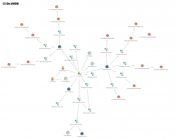 Специалисты «Доктор Веб» так же проанализировали данные из открытых источников и установили несколько электронных адресов разработчика троянов, а также номер его мобильного телефона, к которому привязан используемый для противоправной деятельности аккаунт Telegram. Кроме того, удалось отыскать ряд доменов, используемых вирусописателем для распространения вредоносных программ, а также определить город его проживания. На представленной ниже схеме показана часть выявленных связей Енота Погромиста с используемыми им техническими ресурсами.