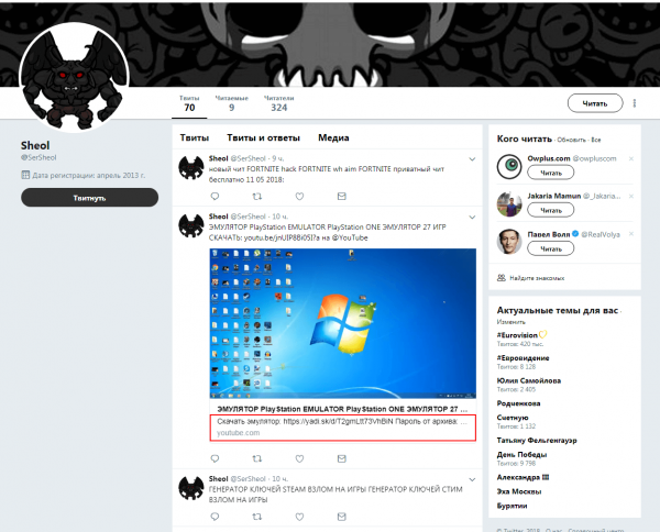 Аналитики рассказывают, что угрозы преимущественно распространяются через ссылки в комментариях, оставленных к видеороликам на YouTube. Сами ролики были посвящены использованию специальных программ, облегчающих прохождение компьютерных игр, — различных читов, гайдов и трейнеров. Злоумышленники оставляют под такими видео комментарии с поддельных аккаунтов со ссылкой на Яндекс.Диск. Также эти вредоносные ссылки активно рекламировались в Twitter.