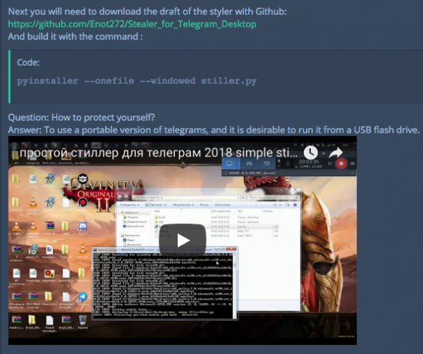 Так, малварь собирает все кеш-данные Telegram и отправляет злоумышленникам. В ходе расследования специалисты даже обнаружили обучающий видеоролик, который детально пояснял, как использовать эти данные для перехвата чужой сессии. К сожалению, в настоящее время видео уже было удалено. Смысл заключался в том, что восстановление кеш- и map-файлов в существующей установке десктопной версии Telegram, при открытой сессии, позволяет злоумышленнику получить доступ к сессии жертвы. В том числе, ко всем контактам и предыдущим чатам. В Cisco считают, что автор малвари и автор упомянутого видео – это одно лицо.