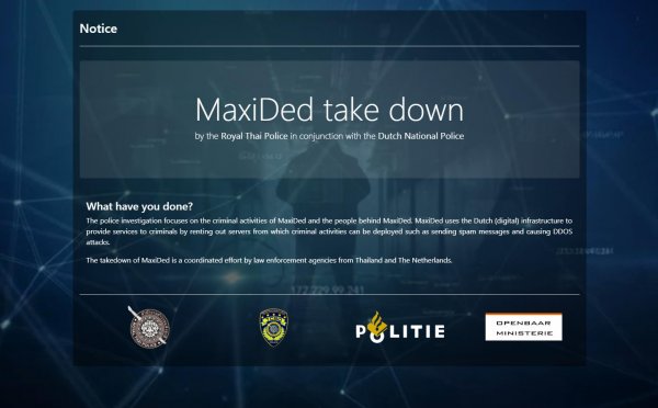 Голландские правоохранители отчитались с совместной операции, проведенной вместе с коллегами из других стран, по закрытию «пуленепробиваемого» хостинга MaxiDed, работавшего с 2008 года и агрессивно рекламировавшегося на хакерских ресурсах. На хостинге размещались управляющие серверы DDoS-ботнетов, сайты с детской порнографией, вредоносная реклама, спамеры и так далее.