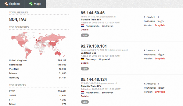 Издание Bleeping Computer отмечает, что, согласно информации с форума Sky Community, атаки на роутеры DrayTek длятся уже около двух недель. По данным Shodan, в интернете можно обнаружить порядка 800 000 устройств DrayTek, однако неизвестно, какой процент от этого количества уязвим перед эксплоитом атакующих.