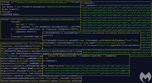 По данным специалистов, на 80% скомпрометированных сайтов были установлены криптовалютные майнеры (в основном скрипты Coinhive). При этом исследователи обнаружили как простые варианты инъекций, так как и глубоко обфусцированные или с динамическим кодом. Таким образом преступники стараются избегать ненужного им внимания и обнаружений.
