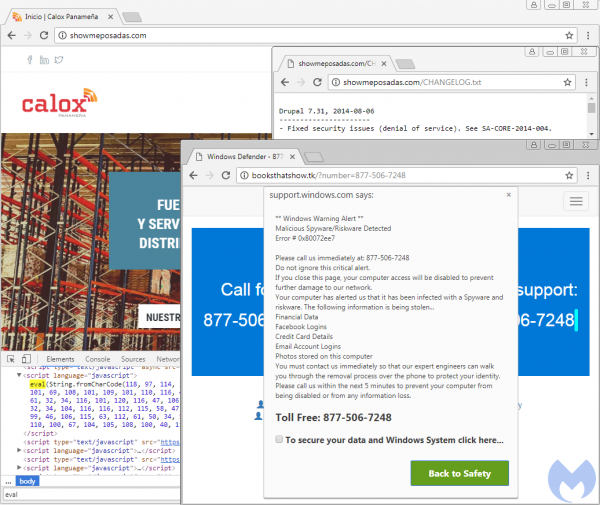 Еще 7% сайтов после компрометации переадресовывают своих посетителей на сайты-локеры, которые блокируют браузер жертвы и вынуждают ее обратиться в фиктивную техническую поддержку, услуги которой, конечно же, оказываются платными.