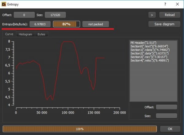 Мы видим, что кода совсем мало, — IDA не разобрала львиную долю файла. Это похоже на какую-то упаковку, поэтому смотрим, что нам покажет Detect It Easy — популярный детектор пакеров и протекторов.