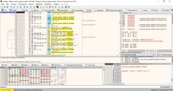Нераспакованный образец GlobeImposter в x32dbg