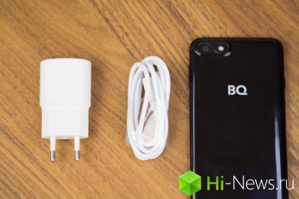 По коробке видно, что производитель решил сделать акцент на стильный дизайн — оформление в духе BQ как бы «кричит» об этом. Комплектация, как и подобает бюджетнику, минимальная: кабель micro-USB и блок питания и документация. Пустяк, конечно, но приятно.