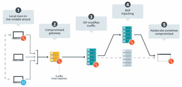 Компрометация осуществляется, когда пользователь загружает установщик Flash с get.adobe.com через HTTP. Трафик перехватывается между конечным устройством и серверами Adobe, что позволяет операторам Turla заменить легитимный файл троянизированной версией. На рисунке ниже показаны точки, в которых теоретически можно перехватить трафик. Пятый сценарий – компрометация Adoe/Akamai – исключен. Атакующие лишь использовали бренд Adobe лишь для обмана пользователей.