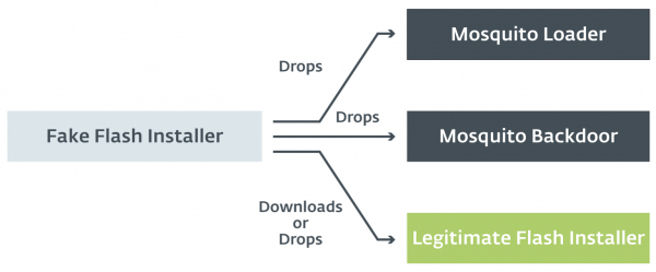 Ранее цепь компрометации включала поддельный установщик Flash, сбрасывающий загрузчик и главный бэкдор.