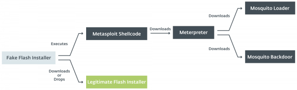 Фальшивый установщик Adobe Flash Player выполняет на целевом устройстве шеллкод Metasploit, после чего сбрасывает или загружает с Google Drive легитимный установщик Flash. Затем шеллкод загружает Meterpreter – типичную полезную нагрузку Metasploit, позволяющую злоумышленнику управлять скомпрометированной системой. Наконец, на рабочую станцию загружается Mosquito, собственный бэкдор атакующих. Продолжительность такой атаки составляет порядка тридцати минут.