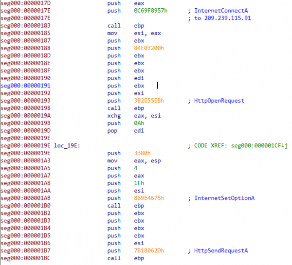 После расшифровки шеллкод связывается с управляющим сервером по адресу 209.239.115[.]91/6OHEJ, управляющим загрузкой дополнительного шеллкода. По данным телеметрии ESET, на следующем этапе загружается Meterpreter. Этот IP-адрес соответствует домену psychology-blog.ezua[.]com, который использовался в кампании Mosquito с октября 2017 года.