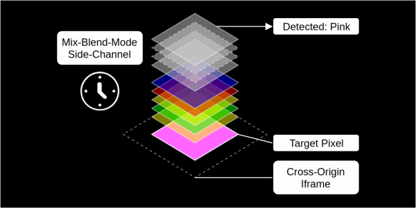 «Мы не можем получить доступ к содержимому iframe’а напрямую. Однако мы можем использовать оверлеи поверх него, каждый из которых осуществляет определенное графическое взаимодействие с лежащими под ним пикселями. Так как оверлеи контролируются сайтом атакующих, появляется возможность определить, какое время занимает это графическое взаимодействие. Некоторые режимы mix-blend-mode требуют различного количества времени, которое зависит от цвета лежащего внизу пикселя. Так, если цвет тестируемого пикселя — это X, то процесс рендеринга займет больше времени, чем в случае с пикселем цвета Y. Такая утечка данных позволяет нам определить цвет каждого отдельного пикселя. Мы не «сливаем» HTML, но используем визуальный контент и iframe’ы», — объясняет Вайсер.
