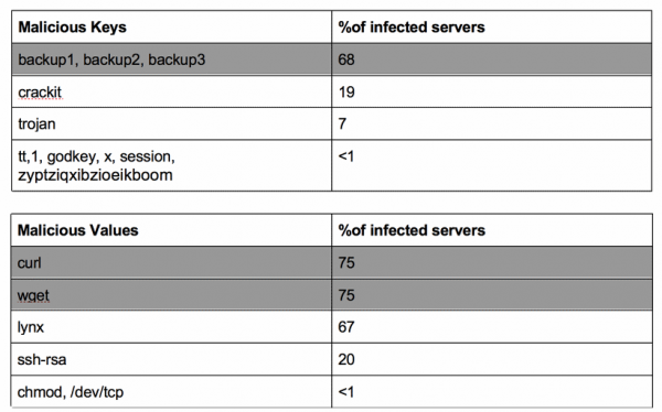 Собирая данные со своих серверов-ловушек, которые были запущены еще минувшей весной, во время изучения RedisWannaMine, исследователи обнаружили несколько стандартных схем, по которым в основном действуют злоумышленники. Так, чаще всего атакующие оставляют на скомпрометированном сервере Redis свои ключи SSH, чтобы иметь возможность вернуться к взломанной системе позже. Затем специалисты заметили, что ключи и значения часто повторяются и полностью совпадают, что указывало на активность ботнета, которым управляют одни и те же люди.