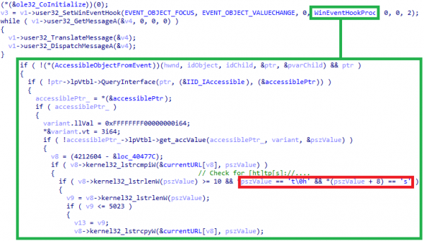 Малварь отслеживает URL посещаемой страницы, устанавливая перехватчики событий (event hooks) для определенного диапазона релевантных событий доступных через цикл ожидания сообщений Windows, таких как EVENT_OBJECT_FOCUS, EVENT_OBJECT_SELECTION, EVENT_OBJECT_NAMECHANGE и нескольких других. Обработчик ищет значения URL с помощью поиска по объектам строк, которые начинаются с НТТРS, получаемых вызовом метода get_accValue из интерфейса события IAccessible.