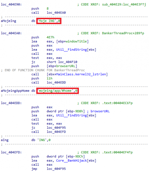 Затем Win32/BackSwap.A ищет адреса, относящиеся к банкам, и заголовки окон в браузере, указывающие на то, что пользователь готовит денежный перевод.