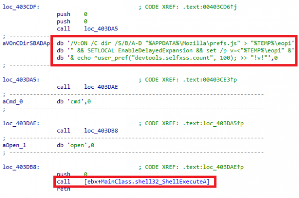 Еще один инструмент защиты реализован в Mozilla Firefox. Браузер запрещает копировать скрипты в консоль по умолчанию; вместо этого он отображает уведомление о возможных рисках и заставляет пользователя сначала вводить вручную фразу «allow pasting», чтобы разрешить вставку скопированных символов. Для обхода этой меры безопасности троян предусматривает исполнение шелл-команды, которая вносит изменения в файл конфигурации prefs.js и удаляет эту защиту.