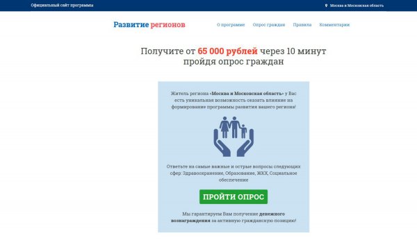 Одним из самых популярных, судя по посещаемости, ресурсов мошеннической сети стала фейковая интернет-платформа «Активный гражданин». Начиная с 11 апреля текущего года, злоумышленники создали шесть идентичных фальшивых сайтов программы «Развитие регионов», на которых посетителям обещали выплатить от 65 000 рублей за ответы на интерактивный опрос о необходимости реформирования ЖКХ, сферы образования и здравоохранения.