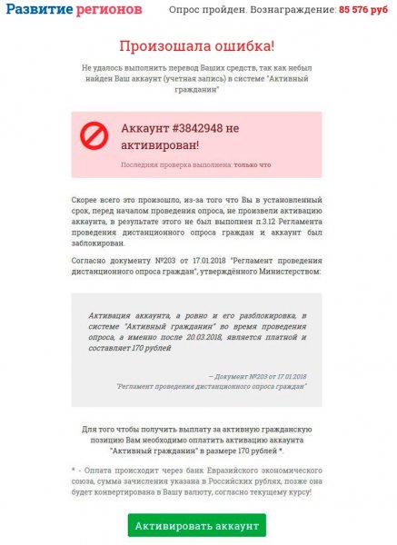 Даже ответив на вопросы, пользователи не могли получить свое вознаграждение из-за якобы неактивированного аккаунта: «Активация аккаунта и его разблокировка в системе „Активный гражданин“ во время проведения опроса является платной и составляет 170 рублей». Чтобы запутать пользователей, мошенники ссылались на некий «Регламент проведения дистанционного опроса граждан» № 203 о 17 января 2018 года. Оплату предлагали провести через несуществующий банк Евразийского экономического союза, но фактически деньги шли через ту же платформу e-pay, которая была задействована в первой схеме.