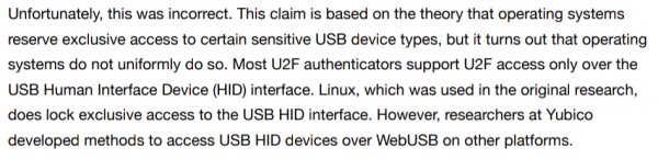 «Исследование Маркуса и Мишеля послужило для нас критически важным фундаментом, и мы совершили ошибку, не обозначив их, как авторов оригинального исследования в нашем докладе. Лишь 13 июня 2018 года, уже после публикации, мы осознали, что Маркус и Мишель тоже обнаружили проблемы HID и сообщили о них в Google. Мы понимаем, что после исправления проблемы нужно было поддерживать связь лучше, чтобы убедиться, что все стороны находятся “на одной волне”», — пишут представители Yubico.