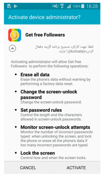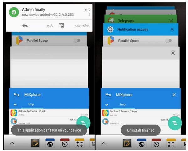 После установки и запуска малвари на экране зараженного гаджета появляется небольшое всплывающее окно. В нем сообщается, что программа не может работать на данном устройстве и будет удалена. Аналитикам встречались образцы с сообщениями на английском и персидском языках (в зависимости от языковых настроек устройства). Когда «удаление» завершено, иконка приложения исчезает. На самом деле в этот момент на стороне атакующих будет зарегистрировано новое зараженное устройство.