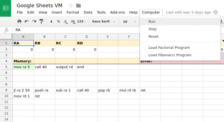 Я думаю, тебе хорошо известно о возможности выполнять скрипты в документах Microsoft Office и Google Drive. Но давай отвлечемся от злокозненных применений и посмотрим, как в электронных таблицах Google можно смастерить простейшую виртуальную машину, которая будет исполнять программы.