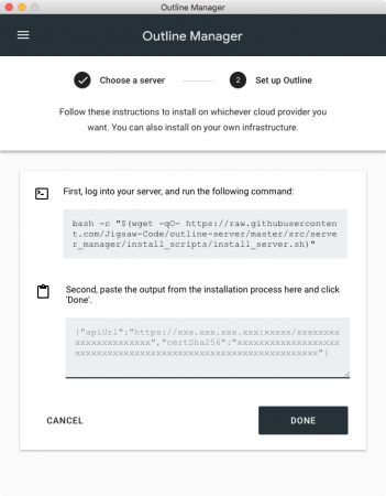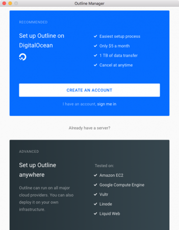 Outline состоит из двух частей — той, что устанавливается на сервер, и клиента, который позволяет управлять этими серверами (и потому называется «менеджер»). При первом запуске менеджер предложит выбор: создать новую учетную запись на DigitalOcean и автоматически залить сервер туда (по дороге выдают кредит в десять долларов при первой привязке карты) либо установить на другую площадку. Во втором случае тебе будет предоставлена команда, которая скачивает и запускает инсталляционный скрипт. По завершении процесса ты получишь строку с настройками — копируй ее обратно в менеджер.