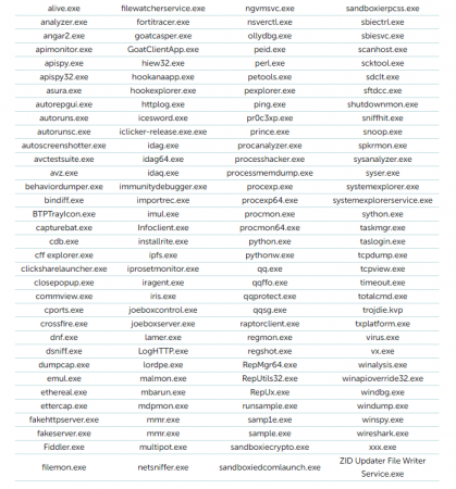 Также малаврь проверяет, не имеет ли она дело с виртуальной машиной, пытаясь найти определенные ключи и значения в реестре, и еще раз внимательно изучая список процессов. Кроме того, название компьютера не должно содержать следующие подстроки: