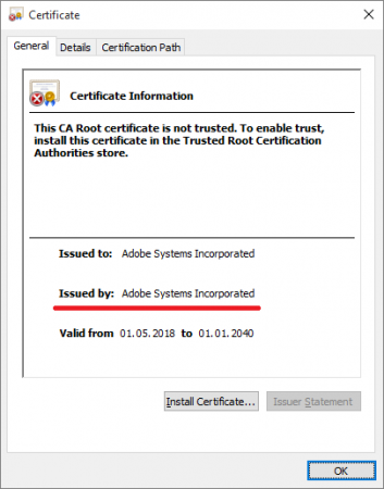 Сразу после запуска загрузчик отображает сообщение об ошибке, которое объясняет жертве, почему не открылся файл PDF. Чтобы малварь осталась в системе незамеченной, разработчики сделали ее похожей на продукты компании Adobe. Это отражается в иконке и названии исполняемого файла, а также в поддельной цифровой подписи, которая использует название компании Adobe Systems Incorporated. Также перед установкой полезной нагрузки загрузчик отправляет HTTP-запрос по адресу www.adobe.com.