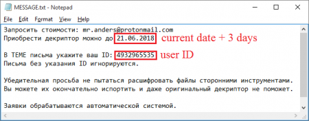 Файлы шифруются с помощью алгоритма RSA-1024, а необходимая для расшифровки данных информация отправляется операторам малвари по электронной почте. В каждой зашифрованной директории Rakhni создает файл MESSAGE.txt со следующим содержимым.