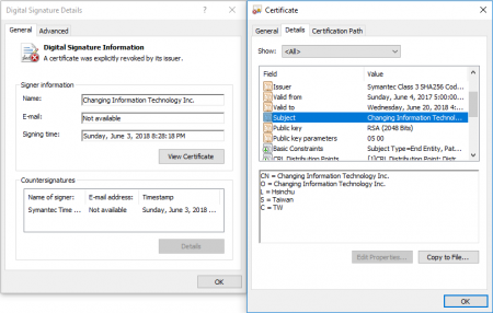 Специалисты компании ESET обнаружили новую вредоносную кампанию, в которой используются сертификаты для подписи кода, украденные у D-Link Corporation и Changing Information Technologies (тайваньская технологическая компания, которая специализируется на продуктах для безопасности).