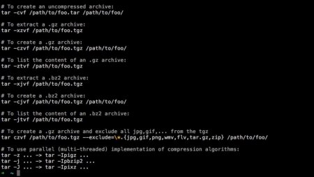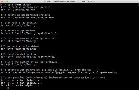 Но самое классное — что устанавливать на компьютер ничего не потребуется. Достаточно просто сделать запрос при помощи curl. Например, curl cheat.sh/tar выдаст наиболее частые варианты использования tar с комментариями. Чтобы печатать еще на две буквы меньше, предлагается использовать короткий URL cht.sh.