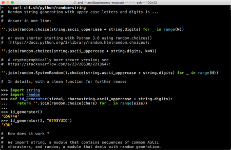 В том случае, если подходящий читшит не будет найден, то сервис попытается сгенерировать его на лету из доступной информации (в основном со Stack Overflow). Так что можешь смело писать что-то вроде curl cht.sh/python/random+string, чтобы узнать, как генерировать случайные строки в Python. Если результат тебя не порадует, можно в конце добавить /2, /3 и так далее, чтобы получить следующие. Правда, сейчас cheat.sh в таких случаях иногда вместо того, чтобы выдать ответ, жалуется на высокую нагрузку и просит подождать.