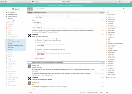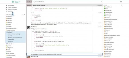 Чтобы посмотреть на Zulip вживую, можешь заглянуть в чат его разработчиков: он находится по адресу chat.zulip.org. Если ты уже имел дело со Slack, то сразу почувствуешь себя как дома: каналы, боты, разговоры картинками, смайликами и вставками из красиво оформленного кода (используется синтаксис Markdown).